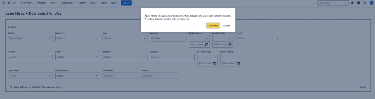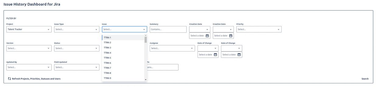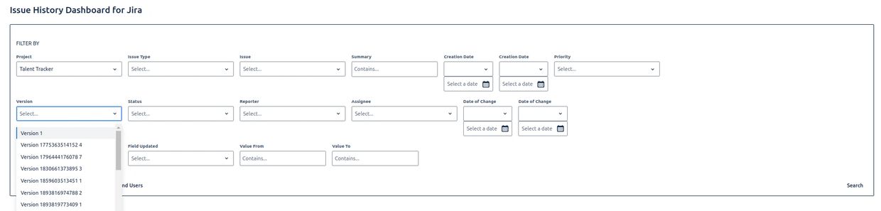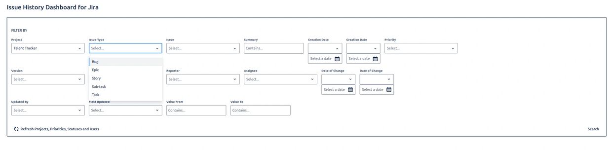 Use this filter to specify a date range for when changes were made to issues. You can set a "from" date, a "to" date, or both.